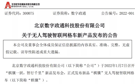 1月7日,北京數(shù)字政通科技股份有限公司(證券代碼:300075)發(fā)布《關(guān)于無(wú)人駕駛智聯(lián)網(wǎng)格車新產(chǎn)品發(fā)布的公告》,正式發(fā)...